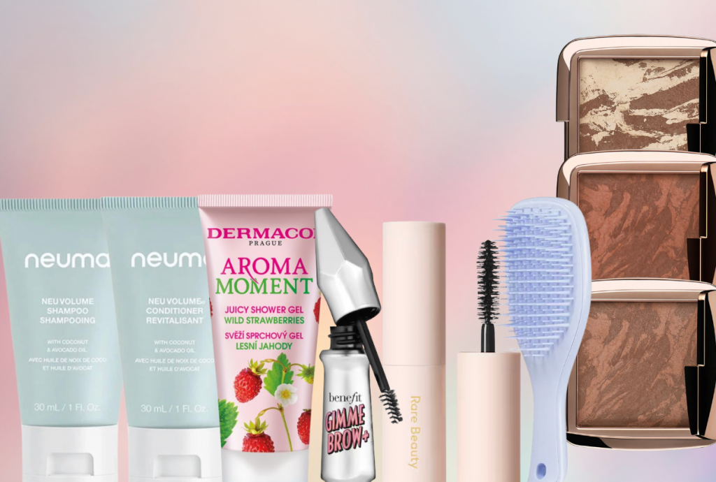 Zdroj foto: Hourglass, Benefit Cosmetics, Rare Beauty, Tangle Teezer, Neuma, Dermacol, Sephora.cz, Alza.sk, Canva